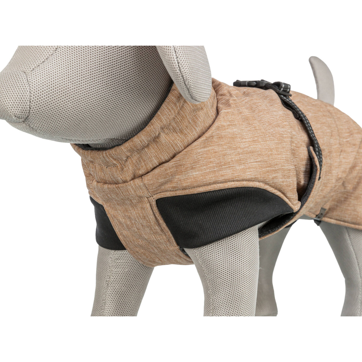 poliéster con forro polar con relleno caliente con dos cremalleras impermeables: una en el cuello para enganchar la correa, la otra en la parte trasera para unir al arnés repelente al agua y al vie…