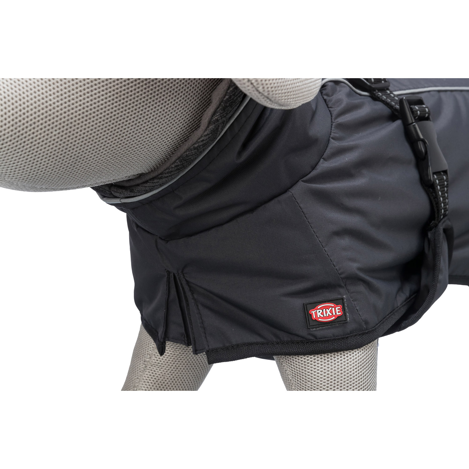 - con dos cremalleras impermeables: una en el cuello para enganchar la correa, la otra en la parte trasera para unir al arnés