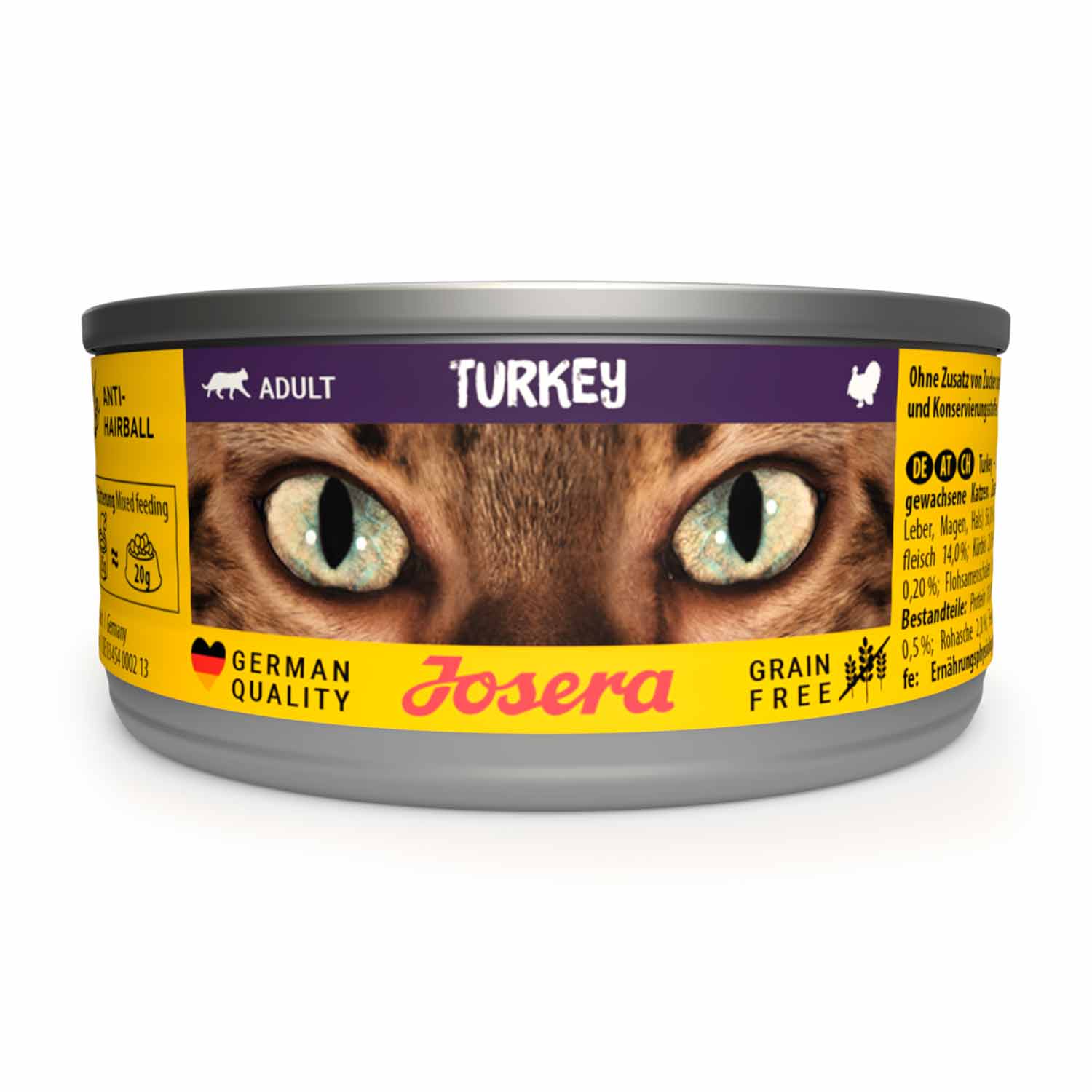 Alimento completo Josera húmedo de Pavo. Receta sin cereales con aceite de salmón que proporciona una fuente natural de ácidos grasos esenciales omega-3, las fibras vegetales dietéticas especiales combaten la formación de bolas de pelo. Con ingredientes cuidadosamente seleccionados favorecen un valor de pH de 6,0-6,5, proporcionando hidratación y sabor a los gatos.